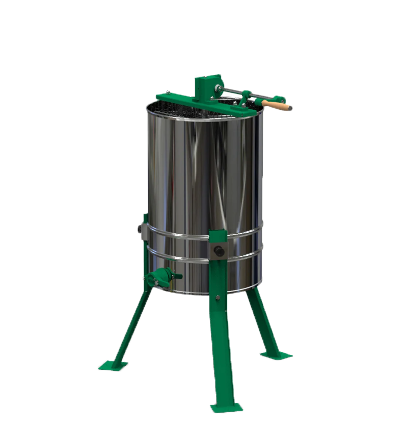 Медогонка предназначена для откачки меда из сотовых рамок. Предварительно распечатанные сотовые рамки, помещаются в кассеты. С помощью ручного привода кассеты приводят в движение. Под действием центробежных сил мед из сотовых рамок вытекает на стенки бака медогонки. Далее мед стекает вниз, на дно бака и через кран сливается в емкость. Есть возможность установки крана из нержавеющей стали. Число оборотов ротора в минуту 160.